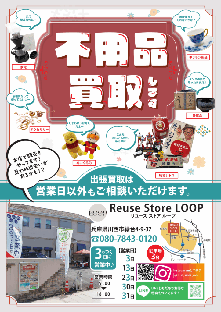 (大型家電、家具、状態の悪いノンブランド衣料、アダルトグッズはお買取りできません。了承ください。)